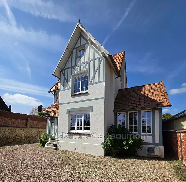L'Immobilière de Beaumont vous propose de vous installer dans cette jolie maison de style anglo normande, entièrement rénovée, avec une alliance de matériaux de qualité, sobriété et goût.