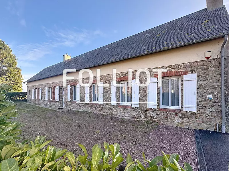 Entre Coutances et La Haye. Proche centre-ville, tous commerces, bord de mer et plage de sable. Longère de plain-pied T6, surface habitable de 113 m². Terrain de 592 m² environ. Séjour lumineux avec grande pièce de vie. Chauffage électrique et cheminée insert. Cuisine aménagée indépendante. 4 chambres. Salle d'eau. WC séparé. Double garage + atelier. Terrasse et cour à l'arrière. Parking devant 4 places. Exposition Est/Ouest. Double vitrage. Tout à l'égout. Dépenses annuelles d'énergie estimées entre 2840 euros et 3900 euros en 2021, 2022 et 2023. Géorisques : www.georisques.gouv.fr Taxe foncière : 882 euros