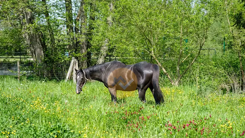 L'extérieur révèle tout le potentiel du domaine : une Vaste prairie, un bois intime, un Ruisseau traversant la propriété et un accès direct aux sentiers de balade. Les installations équestres déjà en place permettent d'envisager facilement un projet Personnel ou Professionnel.