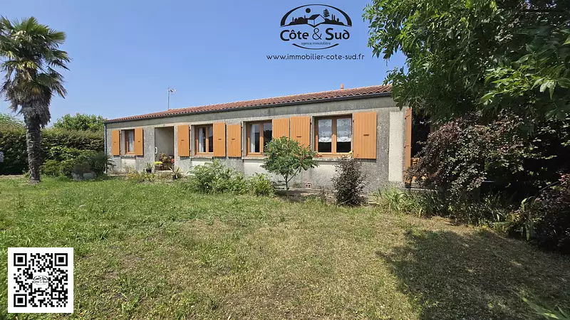 Sur une belle parcelle d'environ 1600 m2 hors lotissement, maison individelle de plain-pied de 1986 à rafraîchir comprenant : entrée, dégagement, cuisine indépendante, pièce, salon / séjour, deux chambres, WC, salle de bains, arrière-cuisine, garage.et cave.
