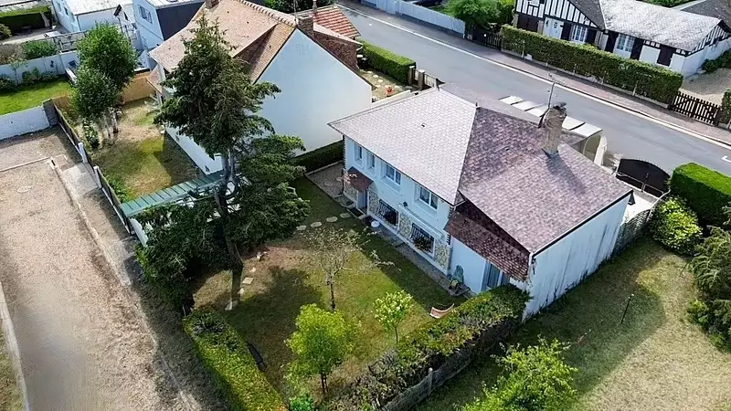 BENERVILLE SUR MER. A quelques pas de la plage de Bénerville et de l'hippodrome, agréable maison très lumineuse édifiée sur une parcelle de terrain accessible depuis un chemin privé. Le rez-de-jardin est composé d'une spacieuse cuisine ouvrant sur le jardin, un salon bibliothèque avec accès jardin, deux chambres et une salle d'eau avec wc. Le premier niveau se compose d'un séjour traversant avec cheminée équipée d'un insert ouvrant sur un balcon terrasse bénéficiant d'une exposition sud-ouest, une cuisine semi-ouverte aménagée et équipée, une chambre avec rangements, une salle d'eau et des wc séparés. Les deux niveaux peuvent être rendus indépendants. Un garage en annexe complète ce bien. Très bel emplacement privilégié pour cette jolie maison sans vis-a-vis.