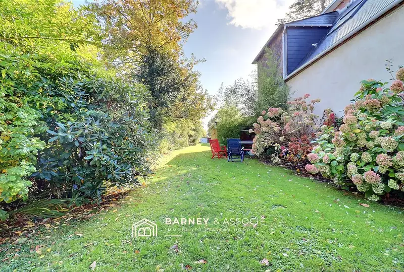 Beau jardin de 750 m² avec un terrasse et un accès voiture, un garage