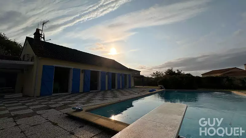 Située dans un secteur calme, cette maison de 115 m² habitables séduit par ses volumes généreux et son extérieur agréable agrémenté d'une piscine creusée. Au rez-de-chaussée, un vaste séjour lumineux de 37 m² vous accueille, en liaison directe avec la cuisine, favorisant convivialité et moments partagés. Cet espace de vie profite d'une belle ouverture sur l'extérieur, idéal pour savourer les beaux jours. L'espace nuit propose deux chambres, chacune disposant de sa salle d'eau privative, garantissant confort et intimité. Un bureau, parfait pour le télétravail, vient compléter ce niveau, ainsi qu'une salle d'eau supplémentaire et des WC indépendants. A l'étage, deux chambres mansardées, représentant environ 24 m² et 18 m² au sol, offrent différentes possibilités : chambres d'enfants, espace invités ou salle de jeux. A l'extérieur, le jardin clos de 2 746 m² accueille une dépendance de 18 m² déjà équipée d'une salle d'eau et d'une kitchenette, ouvrant la voie à de nombreux usages : bureau indépendant, atelier ou hébergement d'appoint. Une terrasse intimiste, nichée à l'arrière du jardin, vient parfaire ce cadre agréable. Fonctionnelle et pleine de potentiel, cette maison attend une famille en quête de tranquillité et souhaitant y apposer sa touche personnelle. Des travaux permettront d'en révéler tout le charme. (5.20 % honoraires TTC à la charge de l'acquéreur.)