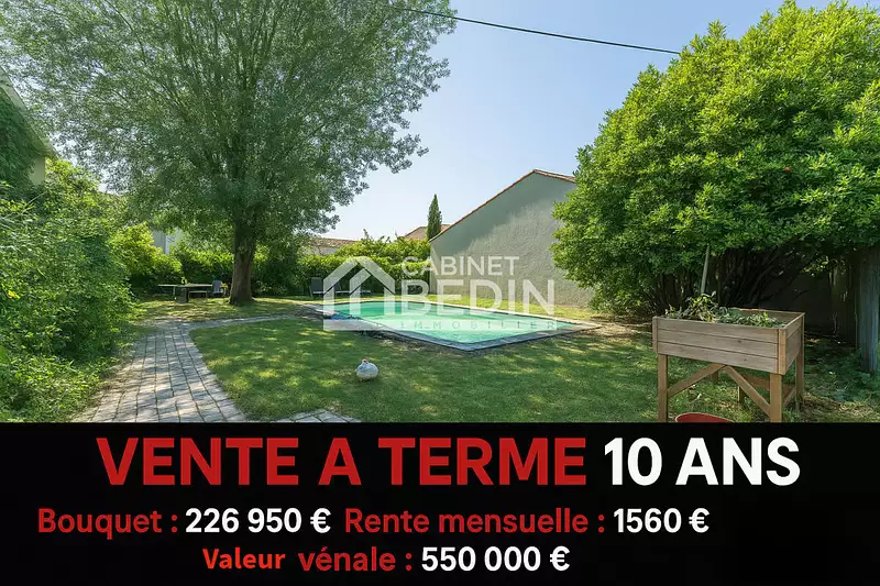 Exclusivité CABINET BEDIN - VENTE A TERME OCCUPEE 10 ANS . Cette maison, située dans le quartier prisé de Caudéran, bénéficie d'un accès facile à la ligne de bus G et à toutes les commodités. De plain-pied, elle offre une pièce de vie lumineuse grâce à une triple exposition, deux chambres, une salle d'eau avec WC, ainsi qu'une salle de bain dans les combles où se trouve une chambre supplémentaire actuellement utilisée en bureau. Le sous-sol comprend un atelier et un cellier d'environ 30 m² chacun, ainsi qu'un vide sanitaire accessible pouvant servir de stockage. Le jardin arboré invite à la détente, agrémenté d'une piscine idéale pour les chaudes journées d'été. Un emplacement de stationnement est disponible sur la parcelle. Vente à terme avec occupation et paiement d'une rente sur 10 ans, paramètres modulables. Homme 76 ans, femme 75 ans. Valeur vénale : 550 000 €. Apport initial : 226 950 € (dont commission de 26 950 € à la charge de l'acquéreur). Mensualités de 1 560 € à régler pendant 10 ans. . Les informations sur les risques auxquels ce bien est exposé sont disponibles sur le site Géorisques : www. georisques. gouv. fr. Montant estimé des dépenses annuelles d’énergie pour un usage standard : entre 1660 et 2300 Euros/an (année de référence 2023) , Surface Carrez 102. 9m²