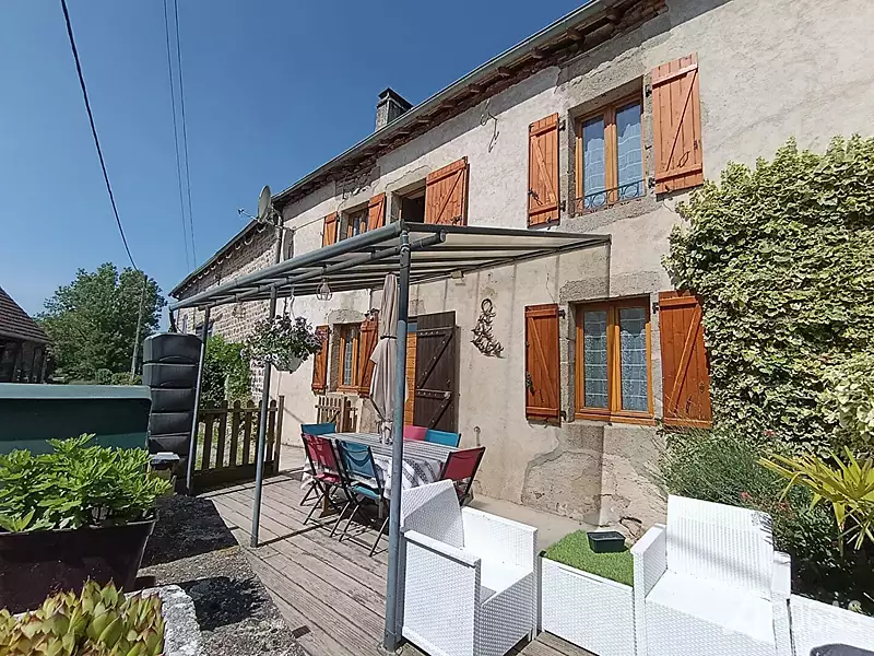 Située dans un hameau à 15mn d'Aubusson, sur la commune de BOSROGER, maison de campagne construite en pierres, avec terrasse, jardin et grange, comprenant : - rez-de-chaussée : grande pièce de vie (35m²) avec belle cheminée en pierres (insert à granulés), cuisine dinatoire indépendante aménagée. - demi-niveau : grand palier avec placards, wc avec lave-mains. - 1 er étage : grand palier desservant 3 chambres, salle de bains. Cave isolée et bien ventilée : buanderie, stockage et présence d'un puits. Fenêtres bois double vitrage. Grenier isolé mais aménageable si besoin. Belle terrasse fermée à l'avant de la maison (exposée sud-est) de 20m² environs, avec pergola. A l'arrière de la maison, grande cour fermée par portail coulissant, grange avec électricité de 60m² au sol sur 2 niveaux, pouvant accueillir 2 véhicules, un atelier, et un espace de stockage à l'étage. Agréable jardin fermé par haies d'arbustes, grillage et second portail, avec poulailler, potager et serre avec réserve d'eau. N'hésitez pas à nous contacter pour plus de renseignements ou organiser une visite. (5.46 % honoraires TTC à la charge de l'acquéreur.) Elodie ABRAHAM (EI) Agent Commercial - Numéro RSAC : 888535606 - GUERET - Tel: 06 71 02 87 11.
