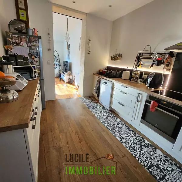 La pièce à vivre, spacieuse et conviviale, est le cœur de la maison, parfaite pour partager des moments en famille ou recevoir des invités. La cuisine attenante représente un véritable atelier pour les passionnés de cuisine, offrant un espace suffisant pour cuisiner dans les meilleures conditions. Pour profitez de la moment ensoleillée vous avez accès directe à une terrasse intimiste et pour un beau jardin sans vis a vis.