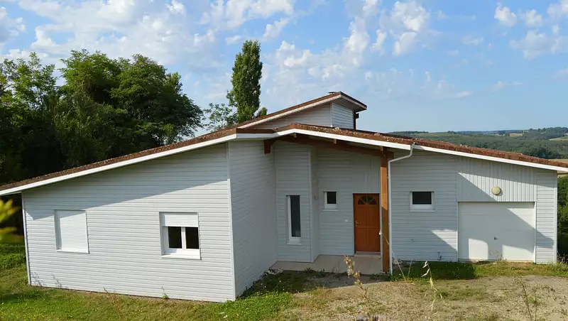 La maison d' architecte et de charme, à ossature bois, bâtie en 2006, offre une surface habitable optimisée et fonctionnelle de 115 m2 environ, avec une grande pièce de vie de pratiquement 60 m2, cuisine ouverte, trois chambres, salle de bains, toilettes indépendantes, cellier et garage. Terrasse couverte de 48m2, donnant plein Sud.