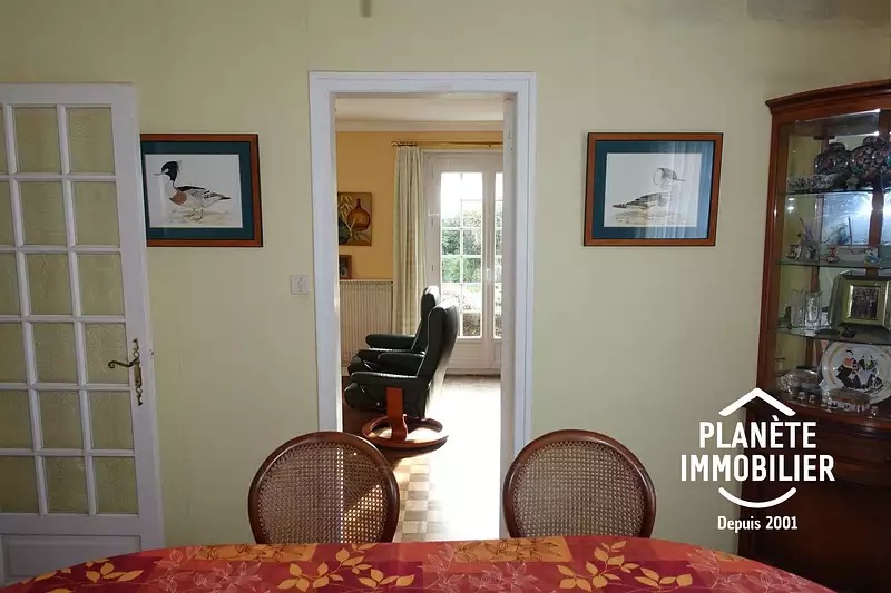 Cette Maison s'organise comme suit : Dégagement d'Entrée, Salon Séjour, Salle à Manger, Cuisine Aménagée Equipée, 1ère Chambre, Salle de Bains et WC en RDC ; 2 autres Chambres, 4e Chambre avec Pièce de 16 m² communicante, Salle d'Eau/WC à l'étage.