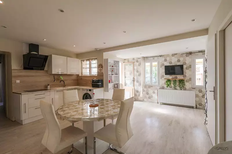 - La cuisine aménagée et équipée ouverte sur le séjour crée un lieu de vie conviviale, idéal pour partager repas et moments chaleureux.
