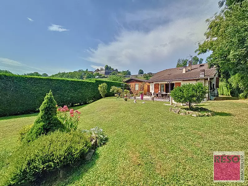 Située dans un écrin de verdure, cette maison d environ 1972, rénovée avec soin en 2007, vous séduira par son charme authentique. Le SAS d'entrée nous mène à la cuisine équipée et à son spacieux séjour de 34m² donnant accès à la terrasse exposée sud-ouest. De plain pied, vous profiterez de deux chambres, un bureau ainsi qu'une salle d'eau et une toilette indépendante avec lave-mains. Les combles aménagés proposent une chambre, un espace bureau et un coin détente. Cette maison offre un confort idéal pour une famille. Un spacieux terrain clos et arboré de 1815m² (parcelle non divisible), exposé Sud-Ouest, sans vis à vis, piscinable, promet de belles après-midi ensoleillées. Un double garage, un atelier, une buanderie et un abri bois viennent compléter le tout. La cour, entièrement goudronnée, propose de nombreux stationnements extérieurs dont l'accès est sécurisé par un portail. À proximité, vous trouverez une école maternelle et élémentaire ainsi que plusieurs commerces, commodités, transports en commun et proche des accès autoroutiers Genève, Annecy...