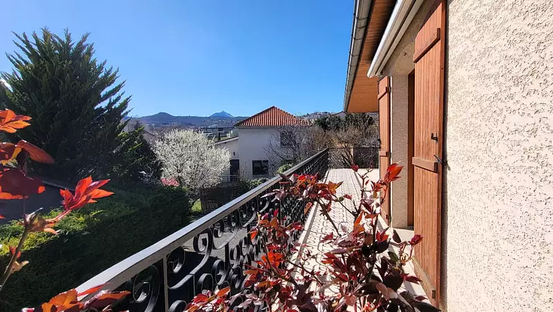 Côté extérieur, la maison bénéficie d'un espace bitumé sur l'avant de la maison, des espaces verts sur les côtés et une terrasse de 30 m² à l'étage ouverte sur la cuisine et le salon offrant une vue dégagée sur le Puy-de-Dôme et le parc Montjuzet.