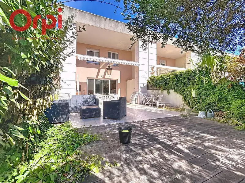 Au rez de chaussée :d'un grand séjour de 27m², une cuisine américaine aménagée et équipée, d'une chambre avec salle d'eau attenante, un WC séparé et enfin un grand jardin avec terrasse exposé SUD de 54m².