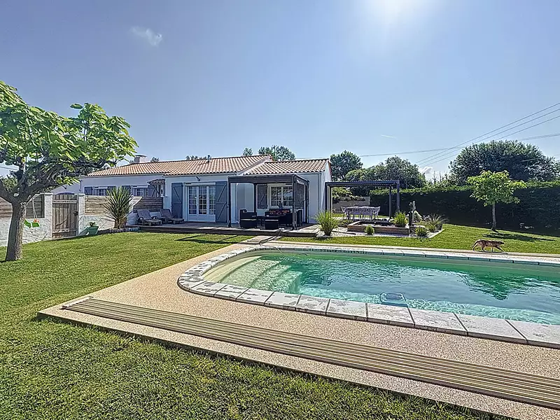 Située en campagne, dans un environnement calme, sans vis à vis, ce plain pied sans travaux offre un cadre de vie paisible sur un terrain clos et arboré de 4000 m². Caractéristiques principales : - Salon lumineux, - Cuisine Aménagée et équipée ouverte sur salle à manger, - Trois chambres, - Salle de bains avec douche et baignoire, - entrée, - Cellier aménagé. Chauffage par pompe à chaleur et ballon thermodynamique pour le confort supplémentaire, un poêle à granules. Garage attenant et garage atelier de 45 m² indépendant. Piscine avec dôme pour le chauffage et la sécurité. L'ensemble est très économique et facile à vivre à seulement quelques minutes de la mer et de Challans. Pour les visites, vous pouvez contacter l'agence au 02 51 68 35 74 (4.84 % honoraires TTC à la charge de l'acquéreur.)