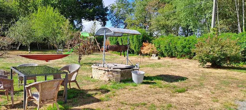 A l'extérieur, le terrain spacieux et arboré de plusieurs fruitiers laisse place à de nombreux projets : jardin, potager, espace détente ou jeux pour enfants. Un puits fonctionnel permet d'arroser facilement les extérieurs, ajoutant un vrai atout pratique.