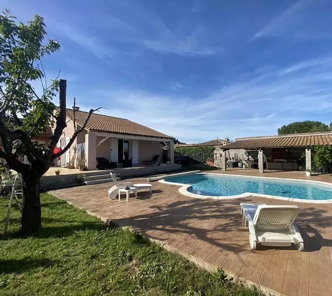 Aucun vis à vis, proche de Pézenas dans village de charme à proximité du centre ville dans quartier résidentiel, villa de plein pied d'une superficie habitable de 117m2 composée d'un hall d'entrée, séjour salon avec cuisine ouverte équipée, 3 chambres dont une avec salle d'eau, wc indépendant, salle d'eau avec wc 1er étage : Mezzanine avec bureau, une pièce pouvant faire office de chambre d'appoint - Piscine avec pool house, garage avec mezzanine