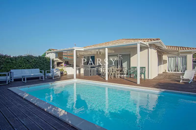 Située dans une impasse calme de Gujan-Mestras, nous vous proposons cette charmante maison de plain-pied en parfait état. Elle se compose d'une entrée avec rangements s'ouvrant sur sa grande et lumineuse pièce de vie de 50m² avec cuisine entièrement équipée. L'espace nuit se compose de trois belles chambres, dont une suite parentale avec salle d'eau et dressing, et d'une salle d'eau indépendante. 2 toilettes indépendantes et un cellier complètent ce bel intérieur. En extérieur, sur sa parcelle de 688m² , vous profiterez d'une terrasse en bois donnant sur sa piscine chauffée (exposition sud-ouest), d'une cuisine d'été, d'un carport et cabanon. Aucun travaux à prévoir, proche des commodités, jardin intimiste.