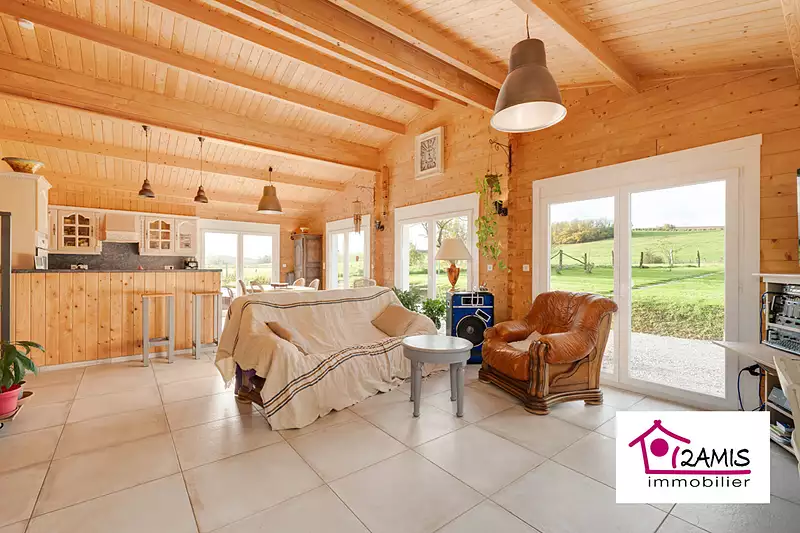 Unique et en Exclusivité cette magnifique maison en bois de plain-pied de 117m2 situé sur la commune de JEVONCOURT sur un terrain plat de 1462m2, dans un environnement calme et verdoyant, orienté plein Sud. Construit en 2018, il bénéficie de toutes les dernières normes de construction et son DPE en A le montre. Laissez-vous guider avec son entrée donnant sur un espace de vie de 50m, orienté Est-Sud-Ouest, baignant dans la lumière et le soleil qui en fait un espace chaleureux et lumineux. De là vous accédez directement à la terrasse et au jardin avec une vue sur la campagne pour admirer les levers ou couchers de Soleil. Ensuite un couloir vous emmène dans les 3 chambres, la salle d'eau avec 2 vasques et 1 douche à l'italienne, un dressing et un cellier. Un poêle à pellets réchauffe l'atmosphère de cette belle demeure, une possibilité de mettre un poêle à bois est prévue et en attente. L'eau chaude est produite par un ballon thermodynamique. Un bâtiment de 3 garages complète cet ensemble mais aussi un espace de stationnement N'attendez pas, contactez moi dès aujourd'hui au O685400973 ou demandez moi les codes de la visite virtuelle