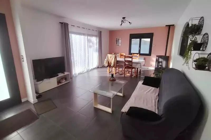 Elle se compose d'une pièce de vie lumineuse avec un poêle à pellets, d'une cuisine semi-ouverte aménagée, de trois chambres, d'une salle de bain et de toilettes séparées.