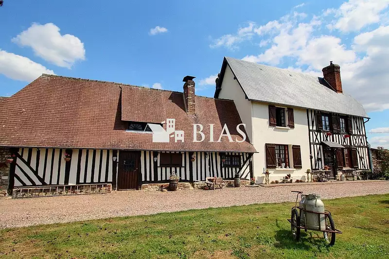 Dans un environnement privilégié, au calme, avec vue dégagée, cette propriété de plus de 7000 m² vous propose une maison normande pleine de charme d'une surface habitable d'environ 118 m², une grande dépendance attenante de 34 m² avec grenier et d'autres bâtiments dont un hangar de 70 m².