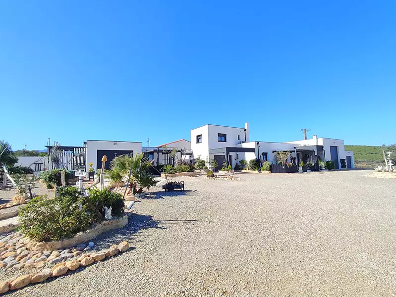 Superbe propriété contemporaine avec vue imprenable sur mer et montagne Située sur les hauteurs paisibles de Treilles, cette récente propriété comptabilisant 119 m² habitable, prend place sur un vaste terrain d'environ 1 610 m², et 133m² d'annexes comptabilisant 1 Grand Hangar et 3 Garages, dans un environnement préservé et exceptionnellement calme. Vue panoramique garantie, entre nature et horizon marin. Le terrain, piscinable, offre de nombreuses possibilités d'aménagements extérieurs. La propriété se compose de deux habitations distinctes : La résidence principale propose une grande pièce à vivre lumineuse, une cuisine moderne entièrement équipée, trois chambres, deux salles d'eau, des WC indépendants, une buanderie fonctionnelle et un espace de rangement. A cela s'ajoute un hangar/atelier de 62 m² attenant, idéal pour le bricolage ou le stockage, ainsi que 2 garages. A l'extérieur, vous profiterez d'une spacieuse terrasse plein sud avec pergola et douche d'été, parfaite pour les journées ensoleillées. La seconde habitation, aménagée avec soin, dispose d'un salon cosy, d'une cuisine équipée, d'une chambre avec dressing, d'une salle d'eau, de deux garages (environ 32 m²) et d'une terrasse privée agrémentée d'un jacuzzi, pour des moments de détente absolue. En complément : une troisième terrasse aménagée avec cuisine d'été et abri de jardin, idéale pour recevoir ou savourer les soirées d'été en toute convivialité notamment grâce à son barbecue. Confort moderne au rendez-vous : climatisation réversible, volets roulants électriques, double vitrage, matériaux de qualité, et même une borne de recharge électrique. Faible Taxe Foncière pour ce bien ! Intéressé(e)? par un coup de coeur? Agence Peyrot Port Leucate - 04.68.53.87.64 -