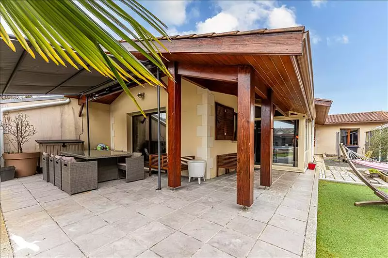 Gujan-Mestras, au calme et à proximités des commerces. Maison avec vaste pièce de vie lumineuse, belle hauteur sous plafond, cuisine avec cellier attenant, trois chambres, un bureau, salle de bains, salle d'eau et deux wc. A l'extérieur, un carport avec garage à vélos et piscine.