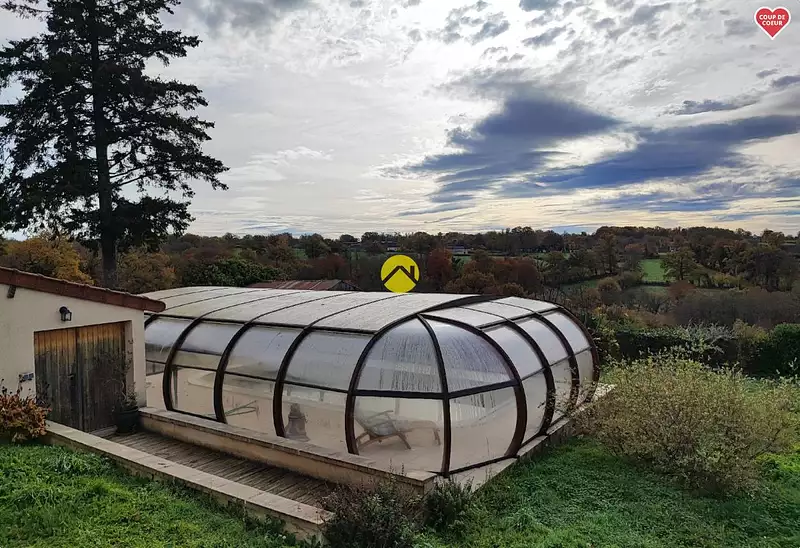 Maison de 119 m² en pleine campagne avec superbe vue sur un terrain de 1 hectare, dépendances et piscine couverte avec pompe à chaleur.