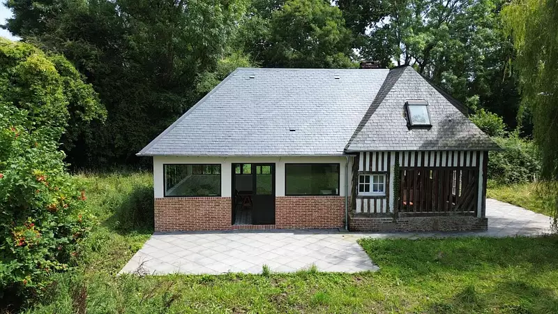 A la campagne, 15 min des Plages , Propriété Normande comprenant/ une maison d'habitation en colombages de 5 pièces entrée sur le séjour/salon avec sa cheminée, trés belle cuisine aménagée et équipée, une chambre, salle d'eau, wc. Trois chambres à l'étage.