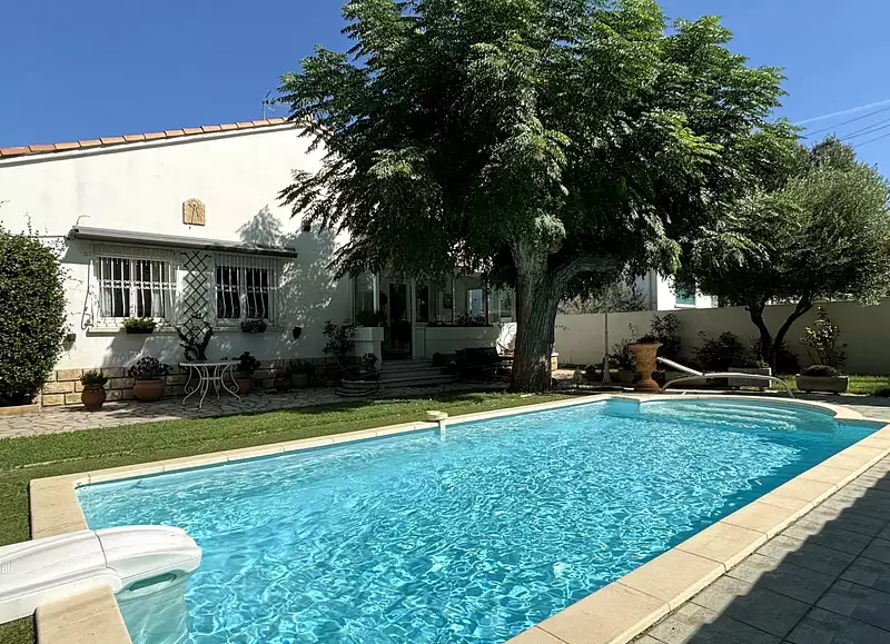 "SOUS COMPROMIS DE VENTE".ARLES, Vente Immobilier,Villa de plain pied au calme, en fond d'impasse sur un terrain clos et arboré de 480m² avec piscine. 3 chambres, Studio indépendant, garage, forage, panneaux photovoltaïque. Aucun travaux, tranquillité assurée! le prix affiché inclut les honoraires d'agence à la charge du vendeur. Les informations sur les risques auxquels ce bien est exposé sont disponibles sur le site Géorisques https://www.georisques.gouv.fr/
