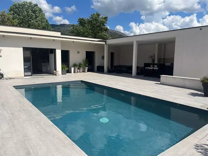 Très belle villa située à l'entrée de Buis-les-Baronnies et de ses commodités implantée sur 500 m2 de terrain clos dans un environnement calme avec vue sur le Saint Julien et le Mont Ventoux. La maison offre de très belles prestations, et se compose d'une cuisine ouverte sur un séjour spacieux et lumineux donnant accès directement à la terrasse agrémentée avec sa cuisine d'été et à la piscine, d'un cellier, de deux chambres avec salle d'eau privative, un wc indépendant et une suite parentale, avec dressing et salle d'eau, donnant sur la terrasse. Le stationnement est assuré par un abri voitures et un garage fermé. La grande terrasse avec cuisine d'été située au bord de la piscine est propice à des moments calmes ou de convivialité. Vous serez séduit par les prestations de qualité et la vue que cette maison offre. Contactez Anouk Breyton - Agence Styl'Immo Buis-les-Baronnies - 06 20 79 37 27 - Annonce rédigée et publiée par un Agent Mandataire -