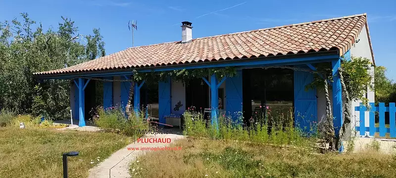 Logement de plain-pied donnant une terrasse couverte avec une cuisine meublée et équipée ouverte sur un beau séjour de 35 m2, trois chambres, bureau, salle de douche, WC.