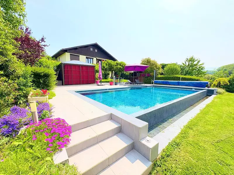 CHENEX. Ravissante maison de 5 pièces d'env 120 m2 habitables au bénéfice d'env. 110 m2 utiles supplémentaires. L'ensemble étant agrémenté d'une superbe piscine à débordement sans vis à vis. Située en bordure de zone agricole dans un environnement paisible et verdoyant, cette maison est édifiée en fin d'impasse sur une parcelle d'env 1600 m2 (Zone constructible). Très rare sur le secteur.