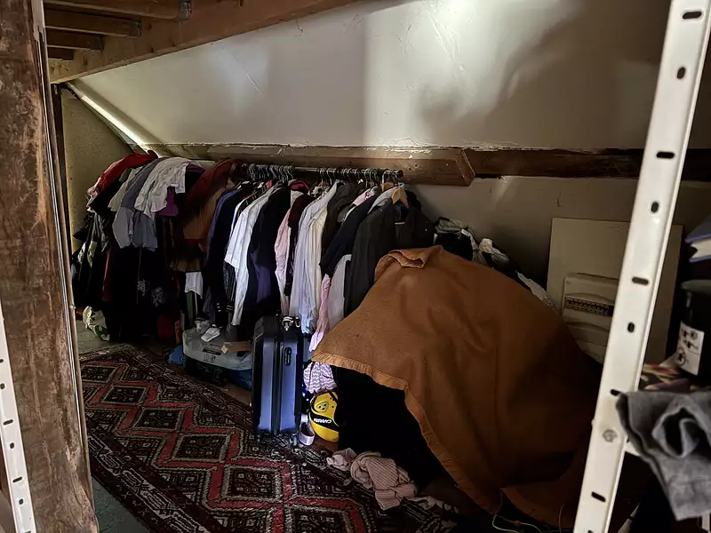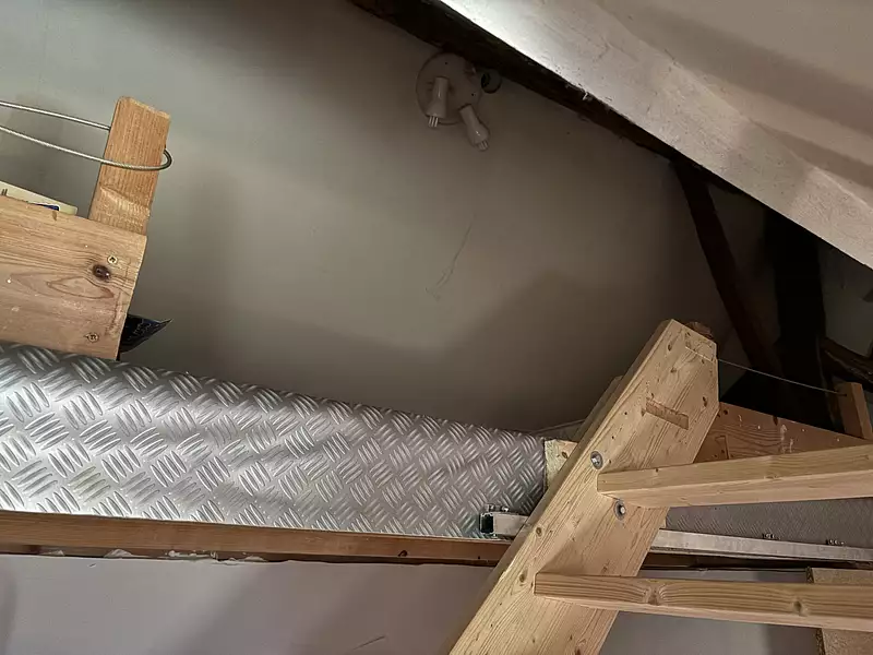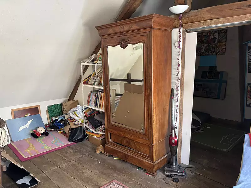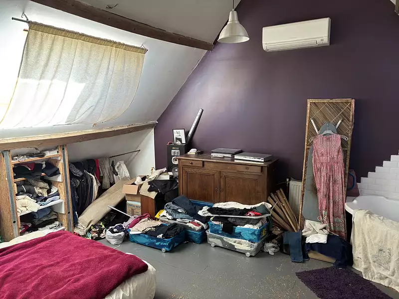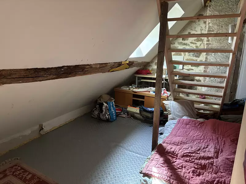 Depuis la pièce de vie, un escalier mène à l'étage supérieur, où un palier spacieux donne accès aux chambres. À gauche se trouve une chambre qui pourrait éventuellement être agrandie en ajoutant une partie du palier à l'espace. A droite, un passage mène à une pièce utilisée comme chambre avec un grenier ouvert pour du rangement, et il y a un couloir vers une chambre spacieuse et lumineuse avec un mur en pierre, une baignoire d'angle, un lavabo et des toilettes privées.