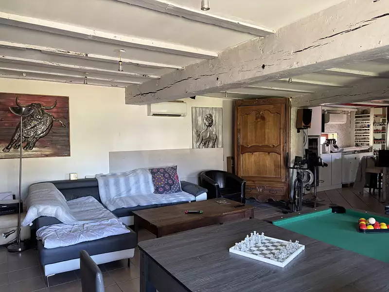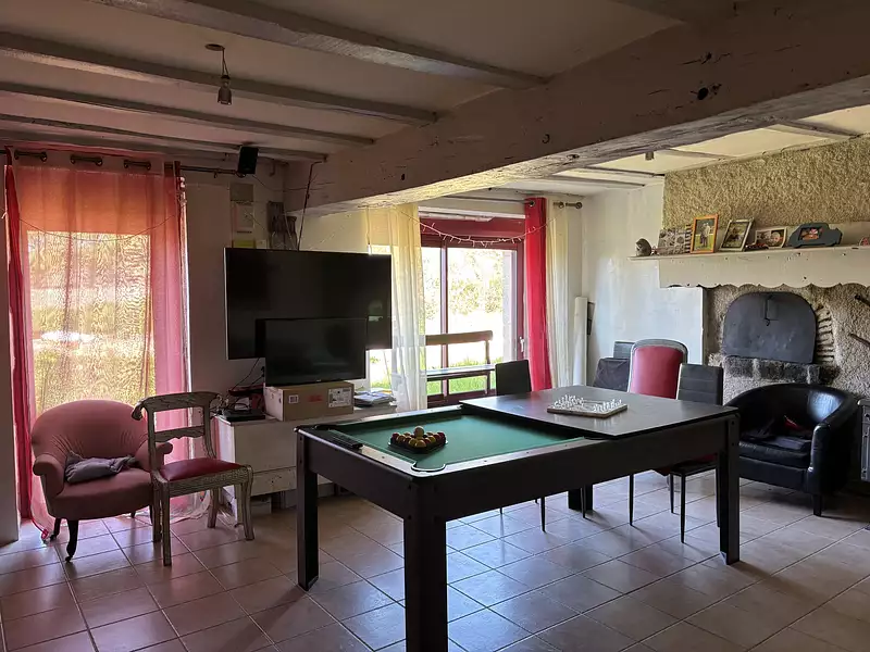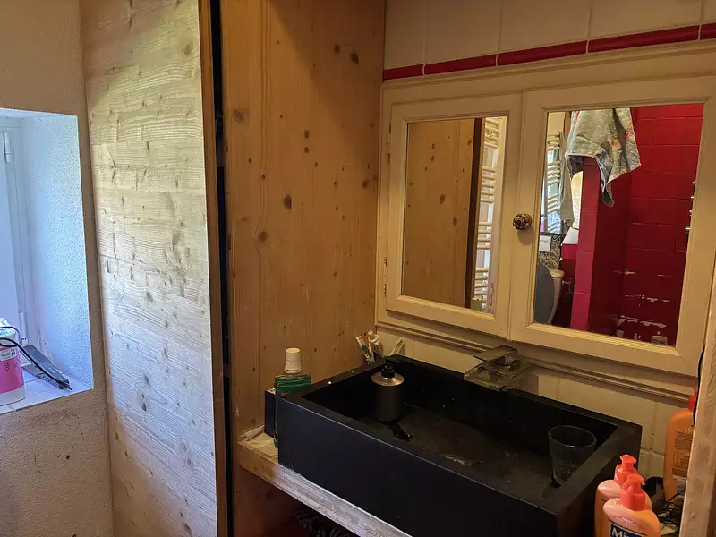 À gauche de la cuisine, une grande ouverture donne accès à l'espace de vie spacieux avec un coin salon et un coin repas. On y trouve un poêle à bois (actuellement inutilisé) et de cette pièce on accède à la salle d’eau avec wc, douche, lavabo et radiateur sèche-serviettes.