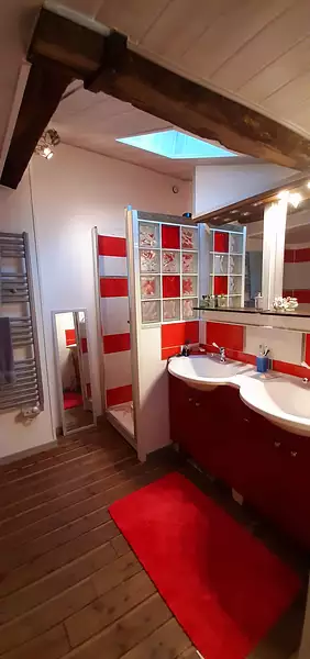 1 salle de bain avec double vasques douche et baignoire
