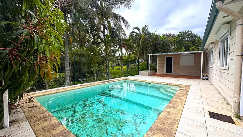 En fond d'impasse, sur un terrain clôturé de 6ares, Villa d 'environ 120m² en ossature métallique comprenant : cuisine équipée ouverte sur séjour , 3 chambres avec placards, une salle d'eau , un studio avec salle d'eau, buanderie , carport et piscine