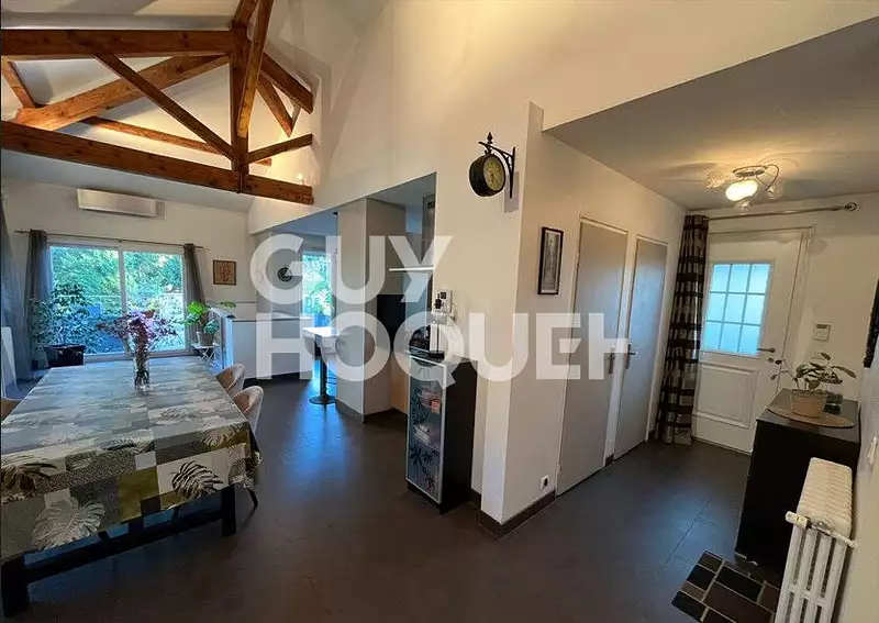 Située dans un secteur calme et recherché, cette maison des années 60 rénovée en 2005 offre 120m² habitables, un sous-sol aménagé de 50 m² et un terrain clos de 612 m² avec portail électrique automatique et digicode. Le jardin arboré accueille une terrasse, un terrain de pétanque, une piscine autoportante (5x3) et un stationnement pour trois véhicules. La maison se compose de deux chambres avec rangements, une salle de bain avec baignoire balnéo et douche à l'italienne, un WC indépendant et un sous-sol fonctionnel avec buanderie, cellier, atelier et garage motorisé. A l'étage, une superbe pièce de vie de 58 m², lumineuse et climatisée, réunit salon, salle à manger et cuisine ouverte, prolongée par un balcon et une grande terrasse de 30 m² avec barbecue. Une chambre avec salle d'eau privative complète ce niveau. Prestations de qualité : chauffage gaz, double vitrage, volets roulants électriques, moustiquaires et adoucisseur.