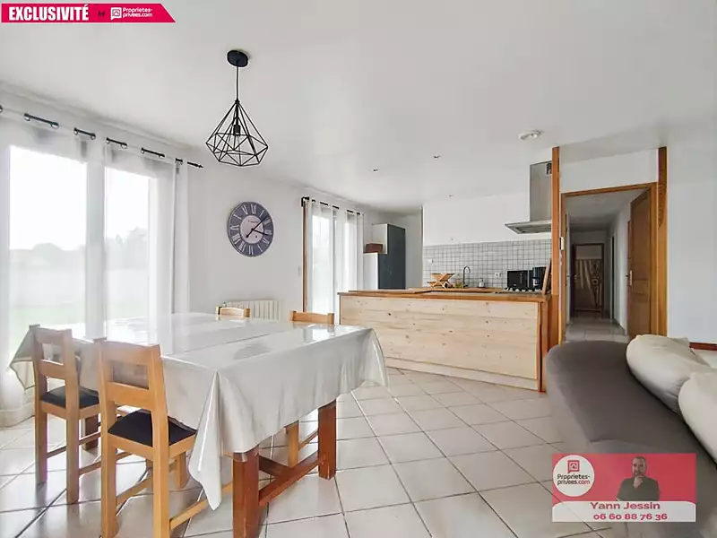 La pièce de vie, spacieuse et traversante d'environ 50m², regroupe salon avec cheminée, salle à manger et cuisine ouverte aménagée. Côté nuit, un couloir dessert trois chambres (de 10 à 12 m²), une salle d'eau et un WC indépendant.