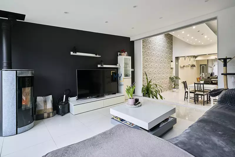 un salon chaleureux agrémenté d'un poêle, donnant directement sur le jardin.
