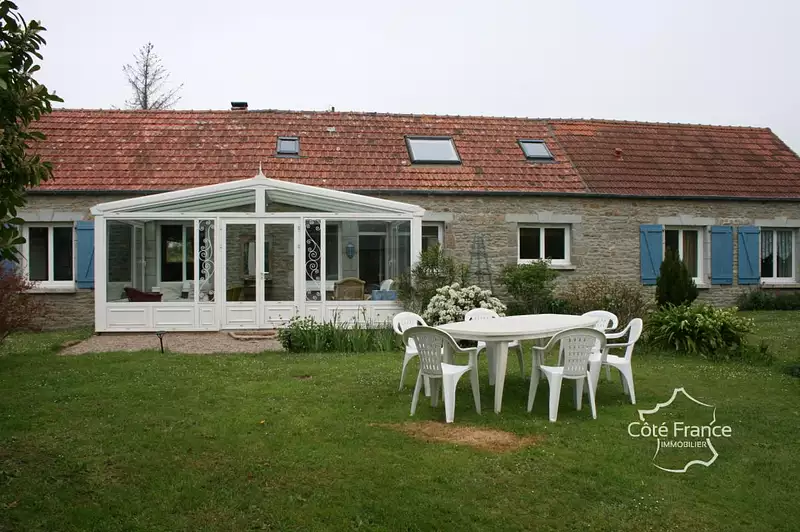 Venez découvrir cette jolie maison en pierre dans un petit hameau au calme, à 5 minutes de la mer. Depuis la véranda de 20 m2 donnant sur le jardin, on entre dans l'espace jour composé d'une grande cuisine dinatoire et un grand salon séjour avec une cheminée et insert. Le dégagement donne sur 2 chambres de rez de chaussée, salle de bain avec baignoire balnéo et une douche,et wc avec lave mains. A l'étage, un grand palier pouvant servir de chambre d'appoint ou bureau, grande chambre et wc avec lave mains. Cellier buanderie attenant. L'assainissement est de 2023 et la véranda de 2005.