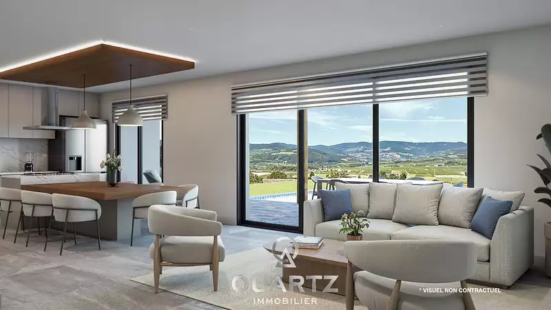 Quartz Immobilier vous propose ce projet de construction pour une maison sur un terrain à bâtir viabilisé d'une superficie de 970 m², au sein du Domaine des Chevrières sur la commune prisée de Chevagny Les Chevrières, dans un environnement résidentiel calme et verdoyant, offrant une vue panoramique sur le Val Lamartinien. Ce projet de maison contemporaine de plain-pied, construite en toiture terrasse, d'une surface habitable de 121 m², pensée pour offrir confort, modernité et fonctionnalité. Conçue pour profiter de cette incroyable vue panoramique, cette maison vous séduira par ses volumes généreux et ses prestations haut de gamme. Agencement intérieur : Grand séjour lumineux de 50 m² Cuisine ouverte (à aménager selon vos goûts) Suite parentale avec dressing et salle d'eau privative 2 chambres confortables Salle de bain familiale WC individuel Buanderie Garage Extérieur : Très grande terrasse de 46 m², entièrement carrelée, idéale pour profiter des beaux jours Prestations incluses : Maison livrée clés en main (peintures et parquets inclus) Menuiseries aluminium gris anthracite Brise-soleils orientables en aluminium motorisés Porte d'entrée tierce design Carrelage grand format (intérieur et extérieur) Parquet dans les chambres Douches à l'italienne WC suspendus Domotique intégrée Pompe à chaleur réversible pour un confort optimal hiver comme été VRD inclus Un bien moderne, prêt à vivre, aux finitions soignées et aux volumes bien pensés, dans un environnement agréable. Ce prix comprend : Le terrain, la maison telle que décrite, l'assurance dommage ouvrage, menuiseries aluminium gris anthracite, brise-soleils aluminium électrique, porte d'entrée tierce, carrelage grand format (y compris terrasse carrelée), parquet dans les chambres, domotique, PAC réversible, WC suspendu, douches italienne, VRD inclus. Ce prix ne comprend pas : Les frais de notaires, les taxes d'urbanisme, les aménagements extérieurs, la piscine, la cuisine et les frais divers non compris. Visuel non contractuel. Ce projet a été réalisé en partenariat avec Val de Saône Bâtiment constructeur de maisons individuelles à Charnay lès Mâcon , qui pourra vous accompagner dans ce projet de construction à adapter en fonction de vos besoins. La commune de Chevagny les Chevrières offre une proximité directe aux axes routiers et gare TGV à moins de 10 minutes. La commune est idéale pour implanter votre future maison, en effet elle bénéficie d'une école maternelle et primaire accessible à pied en 5 minutes, mais également d'une vie associative active. Vous retrouverez un pôle commercial (Supermarché, boulangerie, fromagerie, pharmacie, cave, ...) à moins de 5 minutes en voiture. Contactez nous dès maintenant ! Surface : 970 m² Prix uniquement du terrain : 171 000 euros Coût estimé de la maison par Val de Saône Bâtiment : 349 790 euros TTC Terrain proposé par Quartz Immobilier en partenariat avec Val de Saône bâtiment. Le prix indiqué comprend le terrain + un projet de construction proposé par le constructeur, sous réserve de disponibilité et d'adaptation au terrain. Maison non contractuelle. Prix hors frais de notaire et options. Partenariat sans engagement contractuel. Quartz Immobilier est mandaté uniquement pour la commercialisation du terrain à bâtir, Quartz immobilier ne commercialise pas le projet de construction de maison. Les informations sur les risques auxquels ce bien est exposé sont disponibles sur le site Géorisques : www.georisques.gouv.fr.