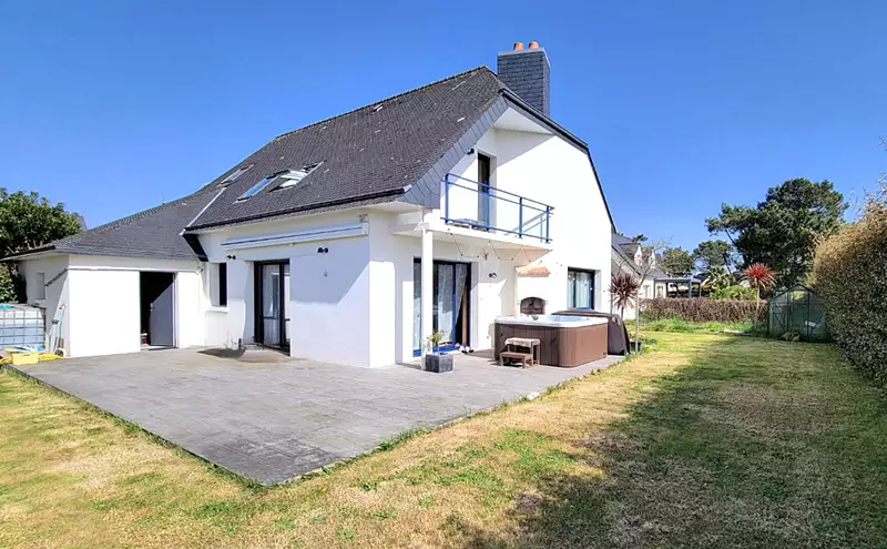 Dans un ensemble situé à proximité du bourg d'Erdeven et en retrait des axes circulants, maison récente (2003) en très bon était d'entretien. L'entrée de la maison se fait par la pièce de vie qui comprend une cuisine ouverte et donné également sur une chambre avec salle d'eau. A l'étage, quatre chambres, une salle d'eau, un WC indépendant et une grande pièce (25 m²) à aménager (ou conserver en grenier). Une des chambres dispose d'un balcon surplombant le jardin, avec une vue dégagée. La pièce de vie lumineuse dispose de deux baies vitrées donnant sur une terrasse exposée au Sud et à l'Ouest et avec peu de vis à vis. , comprenant, au rez de chaussée, une grande pièce de vie lumineuse avec cuisine ouverte, une chambre et une salle d'eau, un WC indépendant et un garage. A l'étage, quatre chambres, une salle d'eau, un WC indépendant et une grande pièce (23 m²) à aménager. Maison en très bon état, avec du potentiel d'aménagement supplémentaire, dans un environnement agréable avec toutes les commodités à proximité. La plage de Kerhilio est accessible en vélo en 10 minutes (3,4 km) via la piste cyclable et les commerces sont à 600 m. (4.71 % honoraires TTC à la charge de l'acquéreur.)