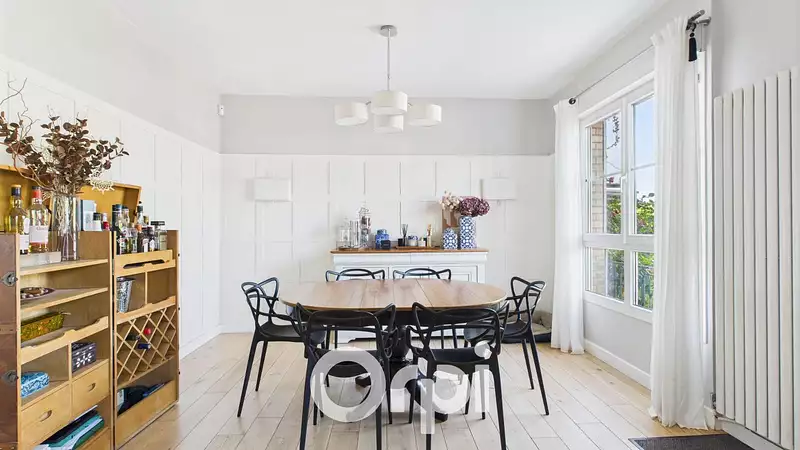 Au rez-de-chaussée, séjour convivial et lumineux, salle à manger, cuisine indépendante aménagée, wc séparés avec lave-mains.