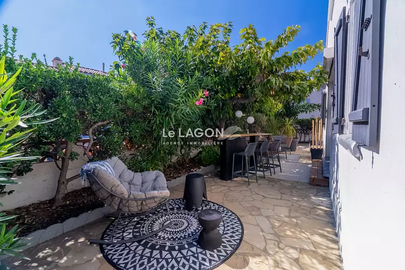 Implantée sur un terrain clôturé et arboré de 500 m² particulièrement intimiste, l'extérieur propose différents espaces dont une cuisine d'été, un coin repas, un coin ombragé pour profiter du calme et de la quiétude des lieux. Plusieurs places de stationnement sont proposées.