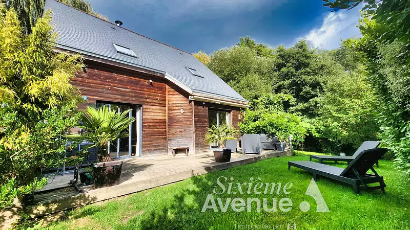 Beaussais-sur-Mer Centre-ville. A deux pas des commerces, des écoles et de toutes les commodités, découvrez cette maison contemporaine en bois construite en 2010, nichée au coeur d'un jardin clos et joliment arboré d'environ 630 m². Dès l'entrée, vous serez séduits par une vaste pièce de vie lumineuse, prolongée par une cuisine américaine équipée et son arrière-cuisine pratique. Un poêle apporte chaleur et convivialité, faisant de ce séjour un véritable lieu de vie. La suite parentale avec salle d'eau complète ce niveau, tandis que le salon et la salle à manger s'ouvre sur une terrasse plein sud pour profiter pleinement des beaux jours. A l'étage, un espace bureau (ou salle de jeux / 4ème chambre possible), deux chambres et une salle de bains avec WC offrent un agencement fonctionnel et familial. La maison développe 122 m² habitables (113 m² Carrez). Un garage fermé ainsi que 2 places de stationnement viennent parfaire cet ensemble rare sur le marché. Un bien chaleureux et économique (DPE C), idéal pour une famille souhaitant s'installer au coeur de Beaussais-sur-Mer. Contactez nous dès aujourd'hui pour organiser une visite et laisser le charme opérer.