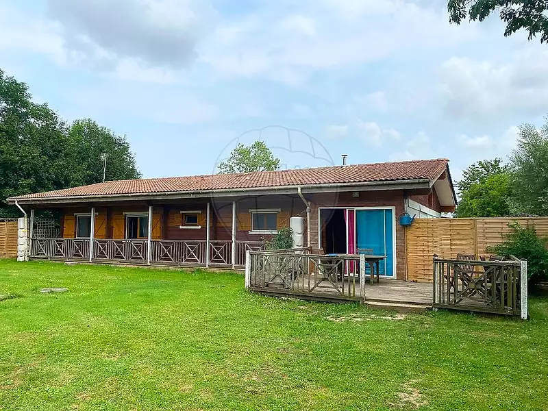 Environnement exceptionnel pour cette maison de plain pied de 122 m2, en bois de haute qualité (sapin du Nord), située dans un écrin de verdure sur une parcelle de 3770 m2.