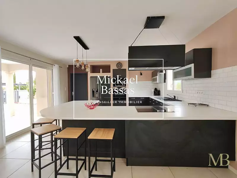 Cuisine ouverte moderne, équipée, donnant sur une terrasse couverte de 18 m² idéale pour les repas d'été