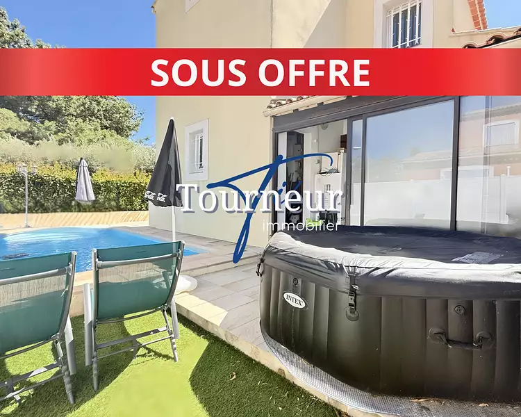 Une villa de 122m2 hab. mitoyenne d'un coté sans vis à vis direct, avec piscine sur un terrain de 314m2.