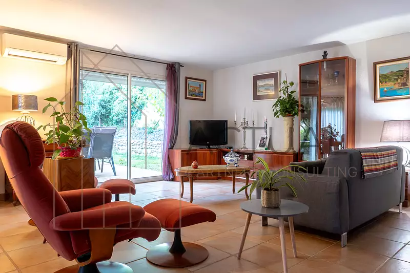 Au rez-de-chaussée, vous découvrirez un spacieux salon séjour, exposé sud-ouest, avec une agréable vue sur le jardin. Le salon est équipé d'un système de climatisation réversible et d'une cheminée, garantissant un confort optimal toute l'année.