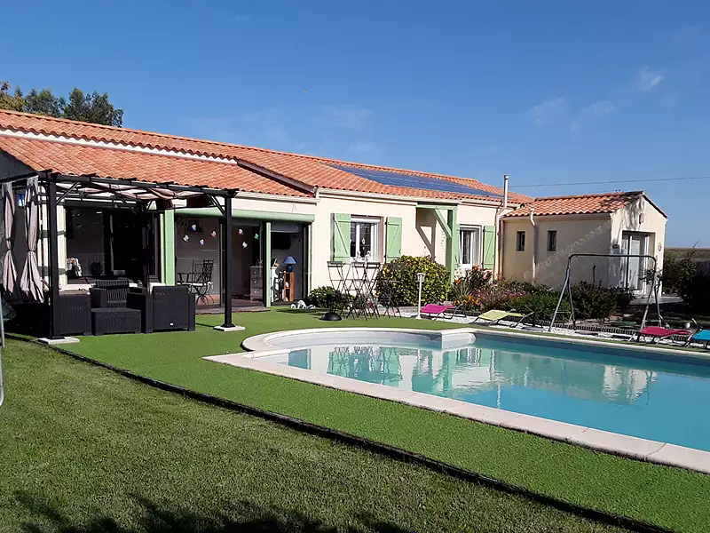 Située à Angles, maison de plain-pied comprenant : une entrée, une pièce de vie avec plafonds rampants et cheminée, une cuisine aménagée et équipée, trois chambres, une salle d'eau avec W.C., un deuxième W.C. séparée, une buanderie,, une véranda donnant sur une piscine creusée 9mx4,5m. Terrain de 1800 m² clôturé avec garage indépendant. Panneaux photovoltaïques, forage. Commerces à 10 minutes à pieds, plage de La Tranche sur Mer à 9km ! Classe énergie D . Estimation des coûts annuels : entre 2090 euros et 2880 euros par an Prix moyens des énergies indexés sur les années 2021, 2022, 2023. Plus d'informations : 0648443569 Corentin Papon (EI) N°RSAC 798880746 La Roche-sur-Yon. - Prix : 379800 euros - Réf. 1211. Les informations sur les risques auxquels ce bien est exposé sont disponibles sur le site Géorisques : www.georisques.gouv.fr Corentin PAPON (EI) Agent Commercial - Numéro RSAC : - .