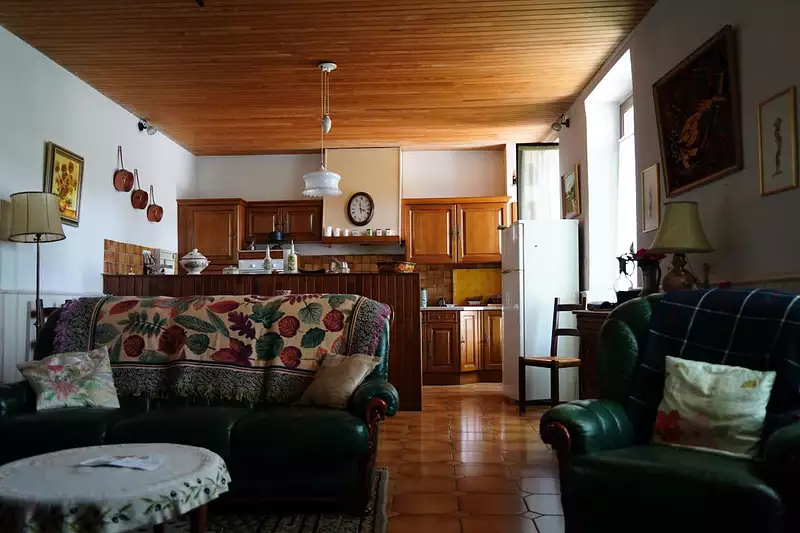 RC. Hall d'entrée, séjour 24 m² avec cheminée insert, cuisine ouverte. de 10 m²